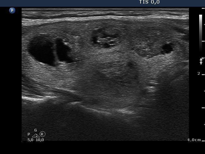 Cytology was performed from two lesions located in the right lobe and resulted in benign colloid goiter and in benign cystic-colloid goiter, nodule in the middle-dorsal part and in the lower pole, respectively.
