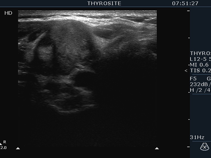 Palpation: a firm nodule in the right lobe.