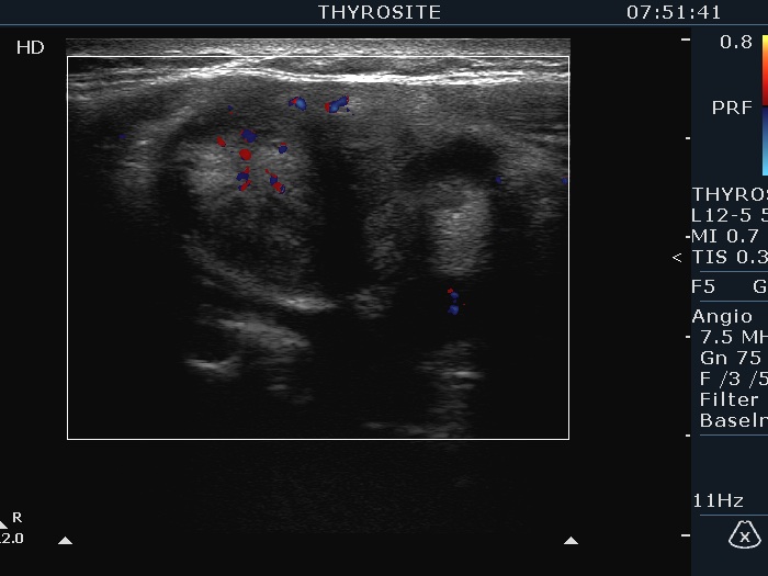 Ultrasonography. The thyroid was echonormal and had multiple nodules. The largest lesion in the right lobe was minimally hypoechoic had irregular borders and presented all three possible signs of an extrathyroidal spread. The vascularity was scanty. The largest nodule in the left lobe was also remarkable due to numerous echogenic lines and granules which were related to ventral cystic areas. So, these were back wall figures.