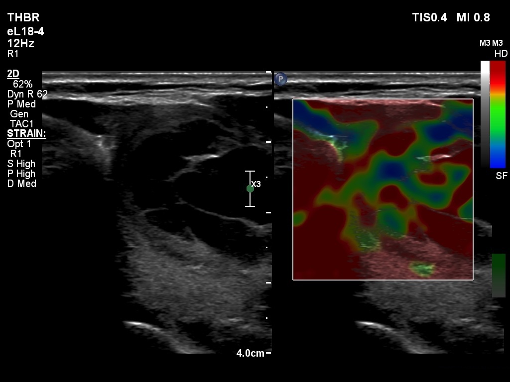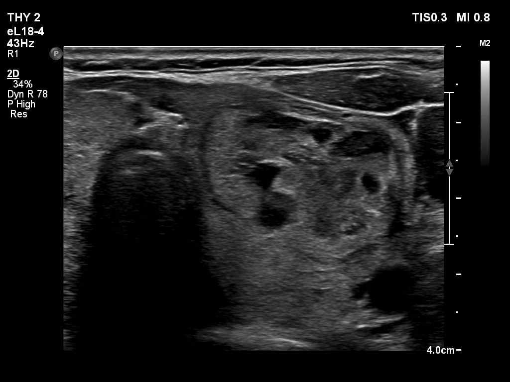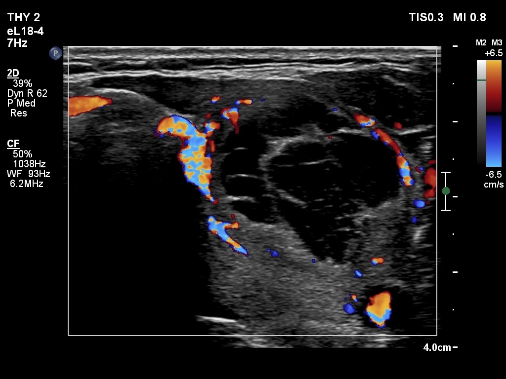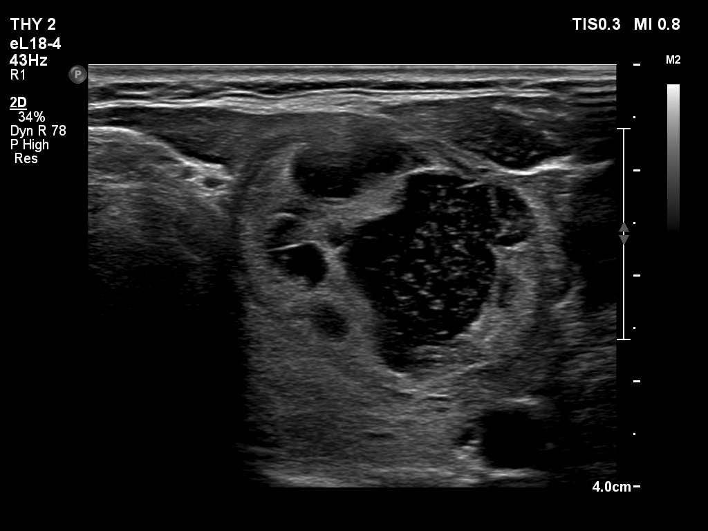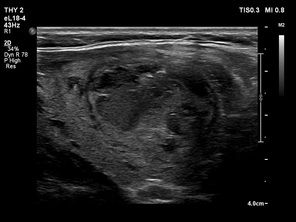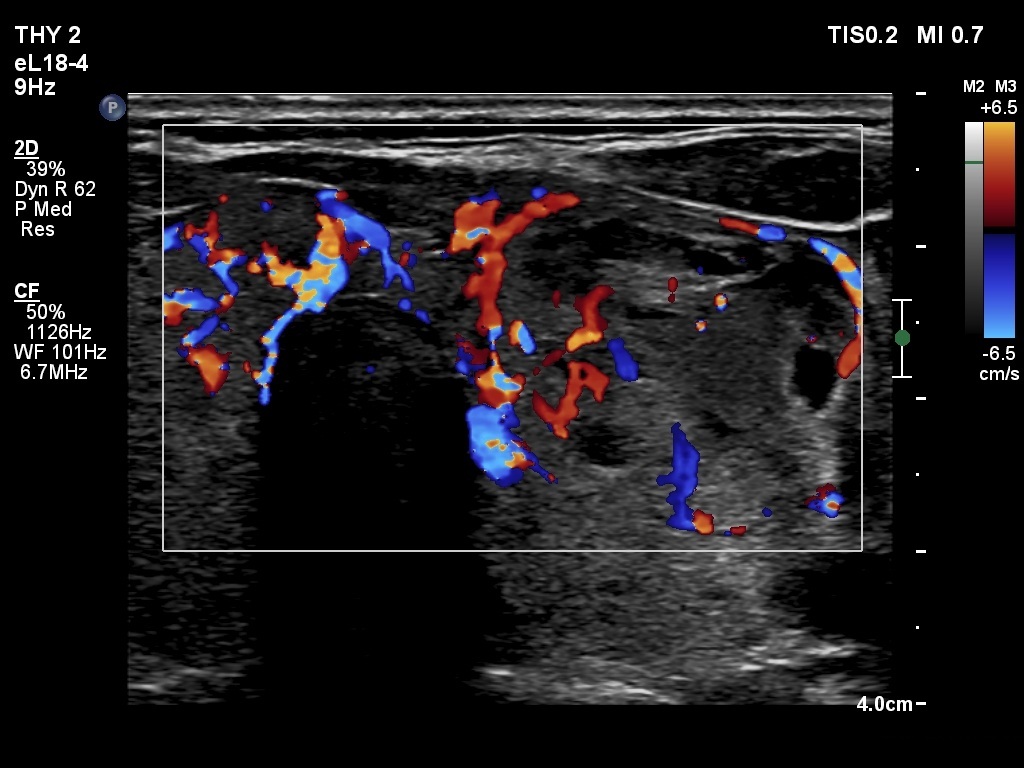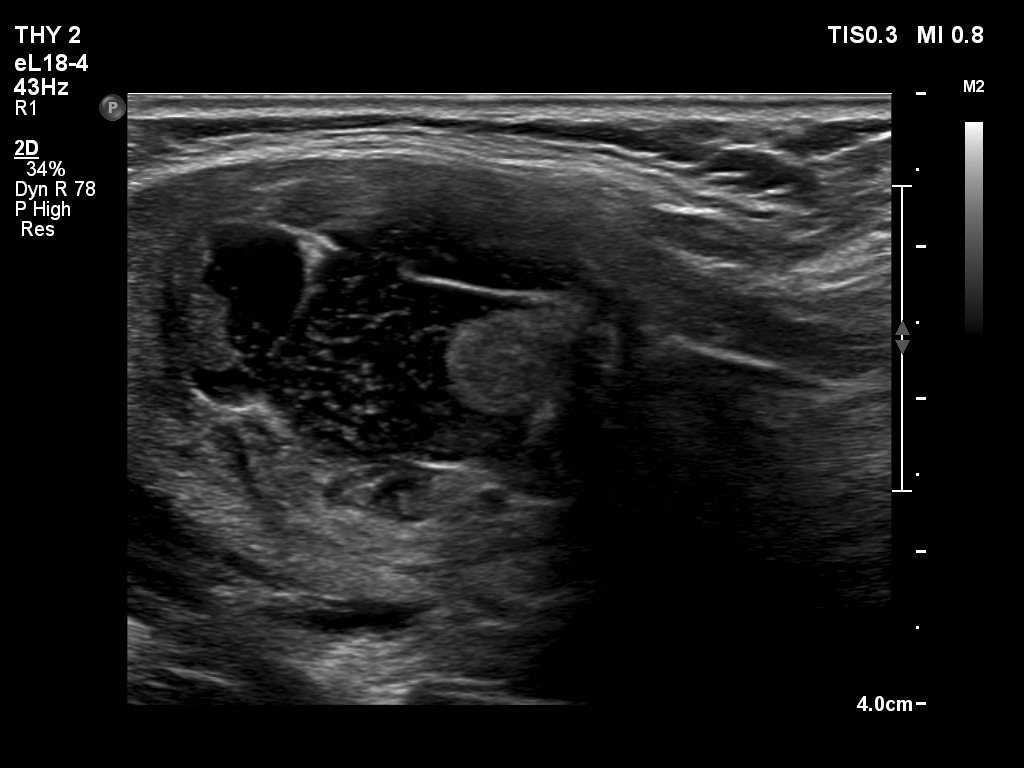 Clinical presentation: A 62-year-old woman was referred for aspiration cytology of a thyroid nodule. The patient has noticed a lump in the left lobe for two weeks.