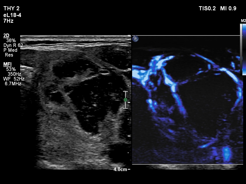 Ultrasonography. The thyroid was echonormal. The right lobe contained several discrete areas without any clinical significance. There was multi-chambered cystic nodule in the left lobe. The nodule had echonormal solid part and presented halo sign.