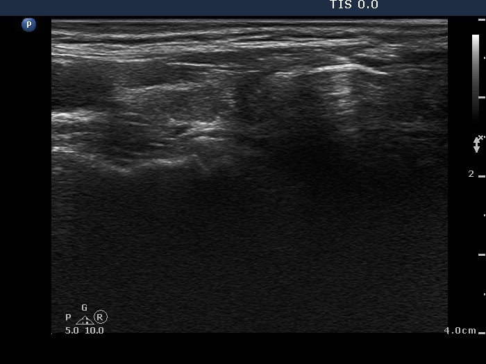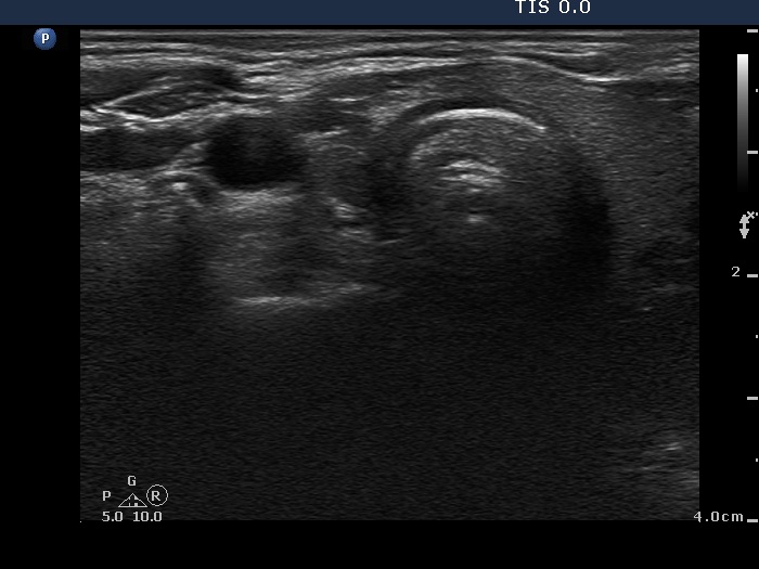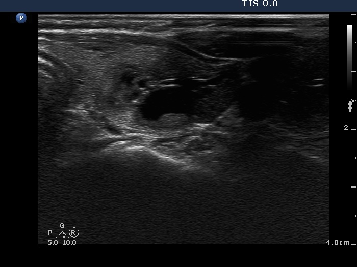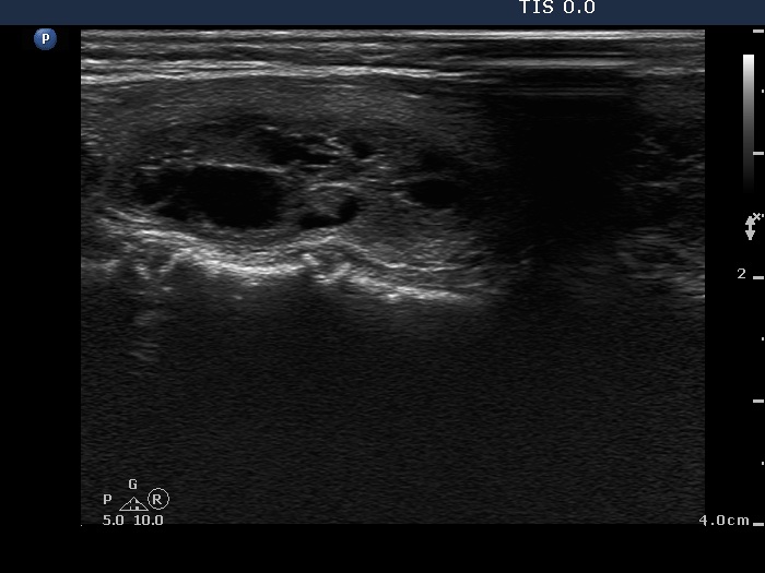 Ultrasonography. There was no parenchyma in the right the thyroid bed. The left lobe was minimally hypoechogenic and had a large, multichambered cystic nodule. There were both hyperechogenic lines and granules within the dorsal wall of the cystic areas. The solid part was moderately hypoechogenic.