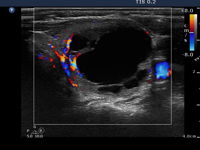 8 mL serous fluid was removed, thereafter the solid part was aspirated. Cytology resulted in benign cystic lesion.