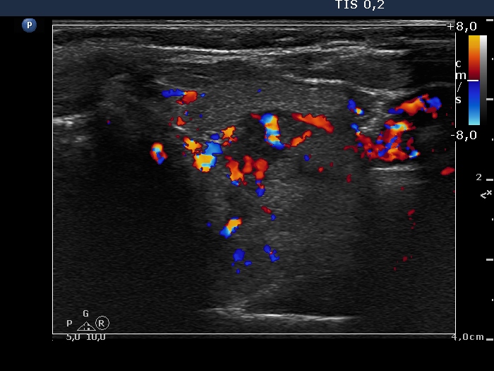 Upper part of the left lobe, transverse scan, color Doppler mode. The nodule displays both perinodular and intranodular vascularity.