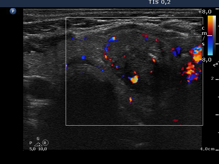 Lower part of the left lobe, transverse scan, color Doppler mode. The nodule presents intranodular flow and signs of perinodular vascularity.