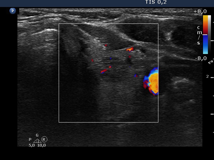 Lower part of the left lobe, transverse scan, color Doppler mode. The vascularization is not specific.