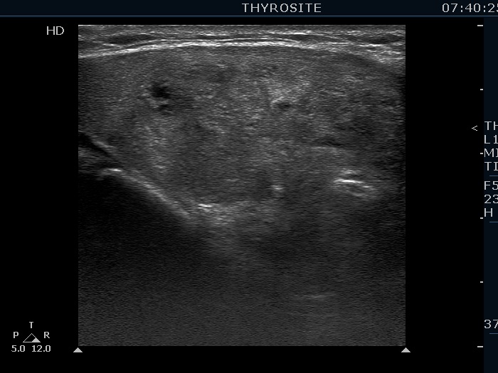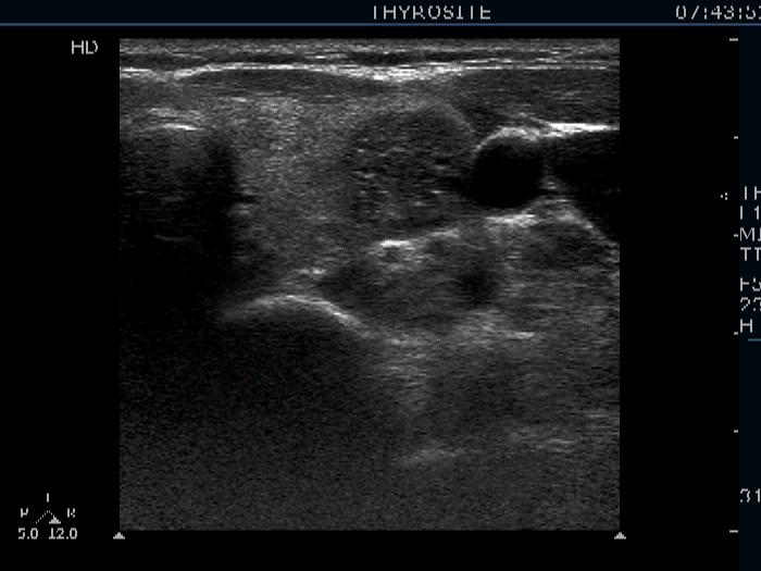 Ultrasonography. The thyroid was echonormal and was composed of multiple nodules. Most of them were hyperechogenic or minimally hypoechogenic. There was a hypoechogenic nodule presenting bright hyperechogenic granules in the upper part of the left lobe.