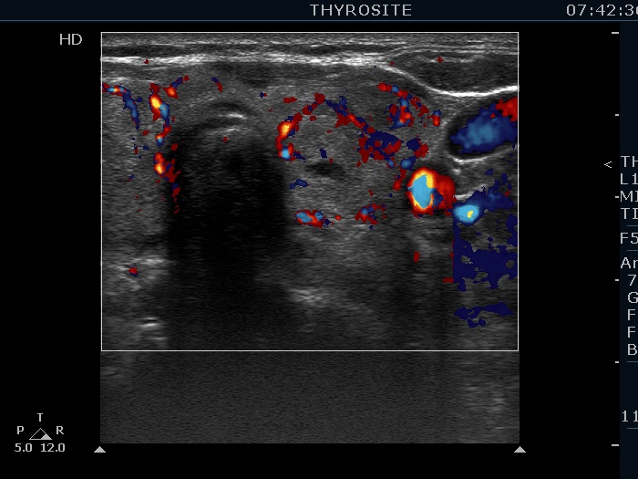 Lower part of the left lobe, trasnverse view, color Doppler mode. Perilesional blood flow is demonstrated.