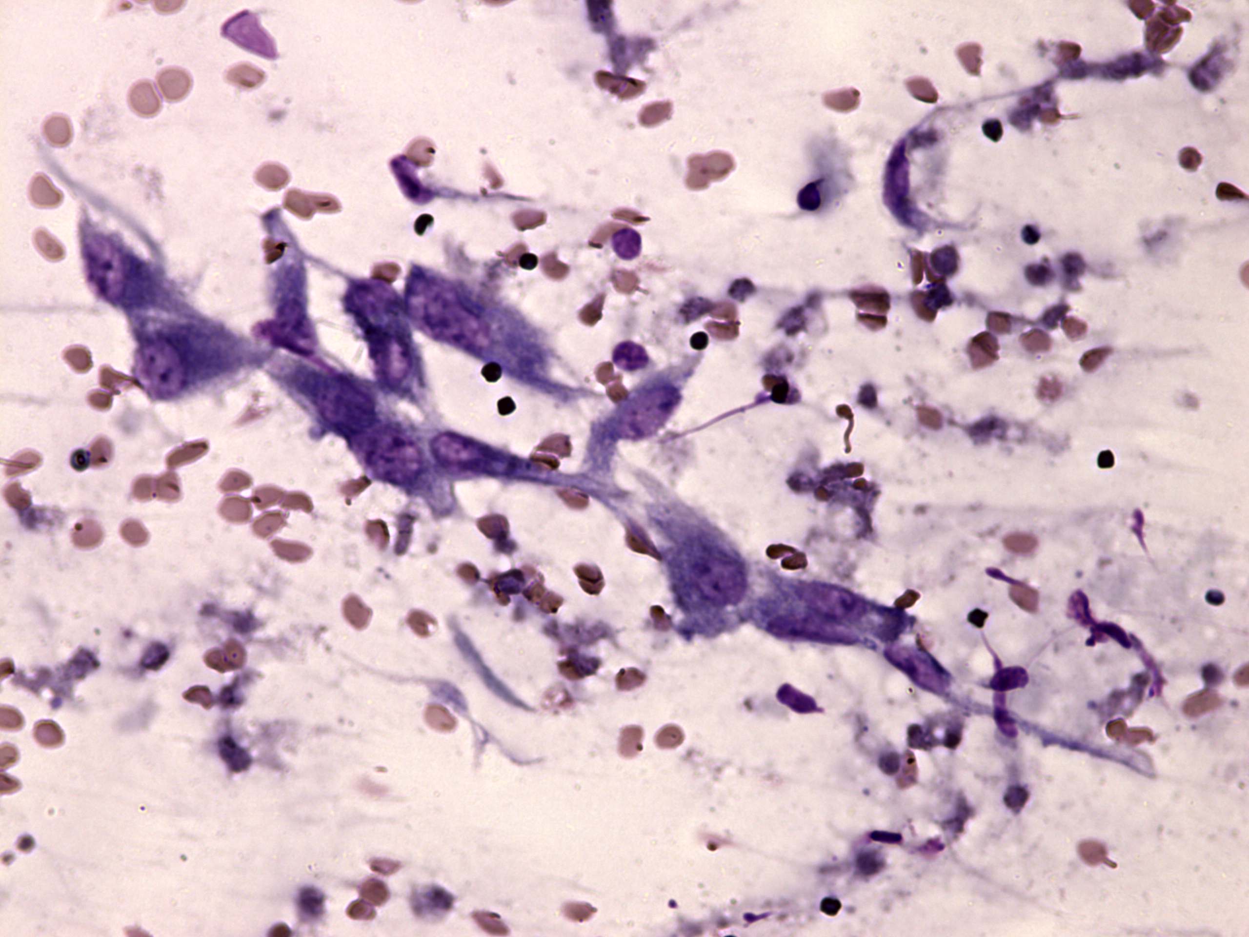 Wright-Giemsa staining, 400x. These cells are thyrophagocytes.