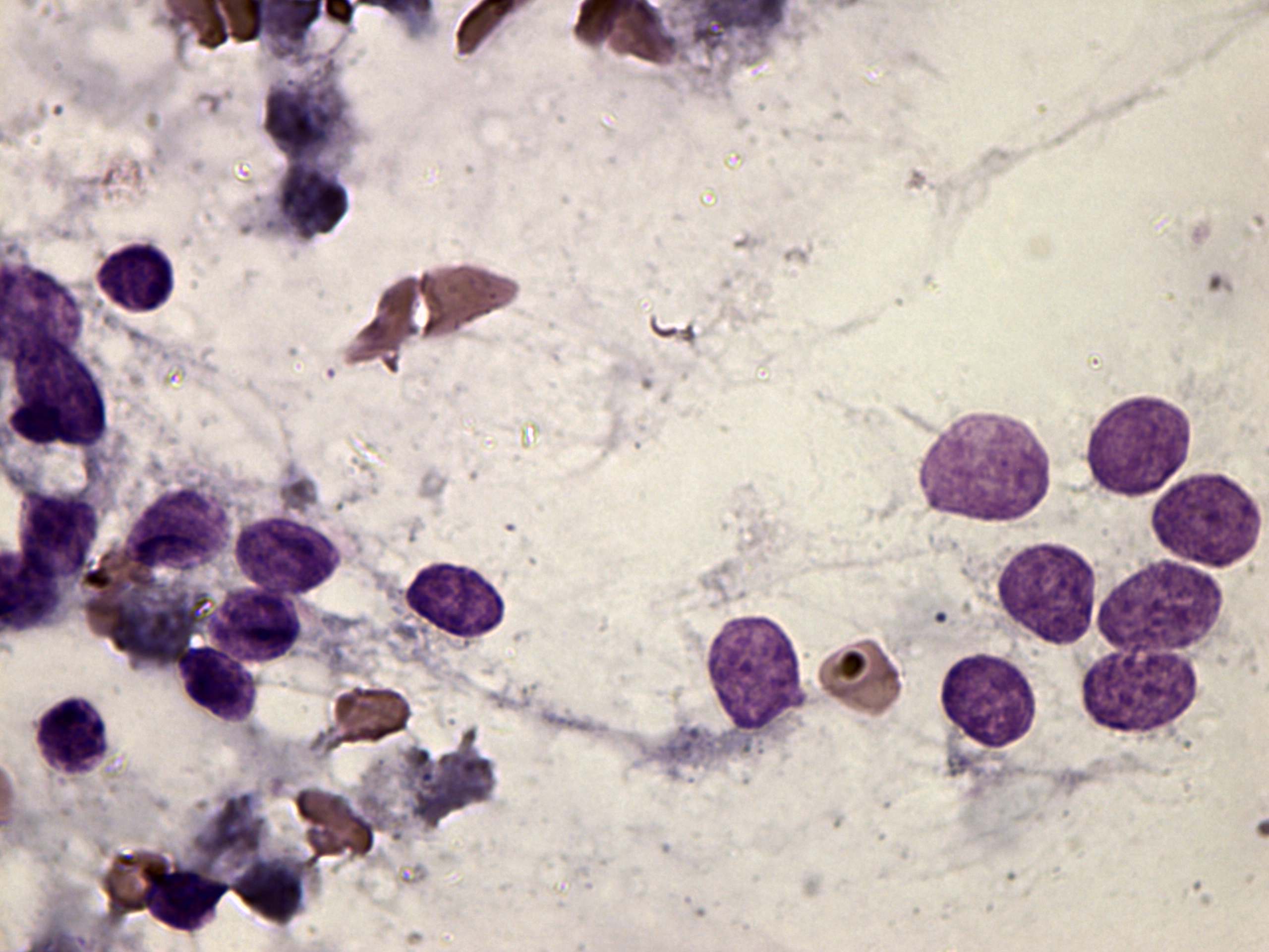 Wright-Giemsa staining, 1000x. Follicular cells show no significant atypia.