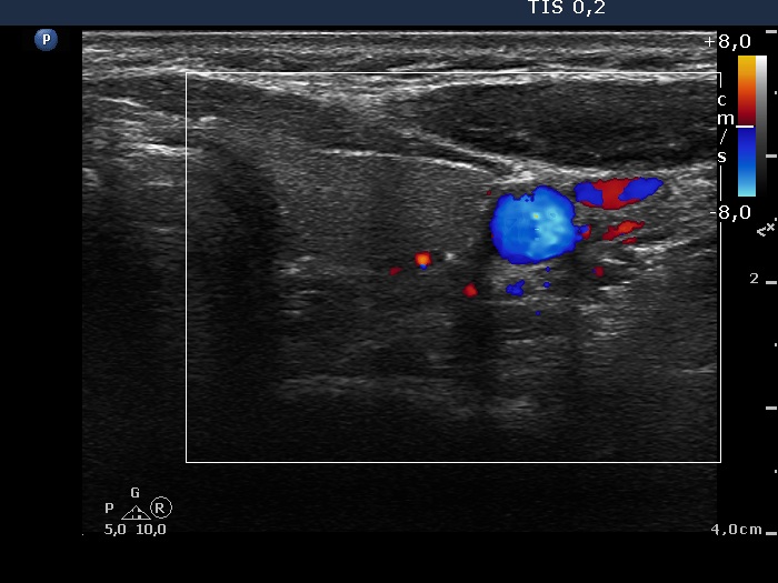 Left lobe, trasnverse scan, color Doppler mode. The vascularization is not specific.