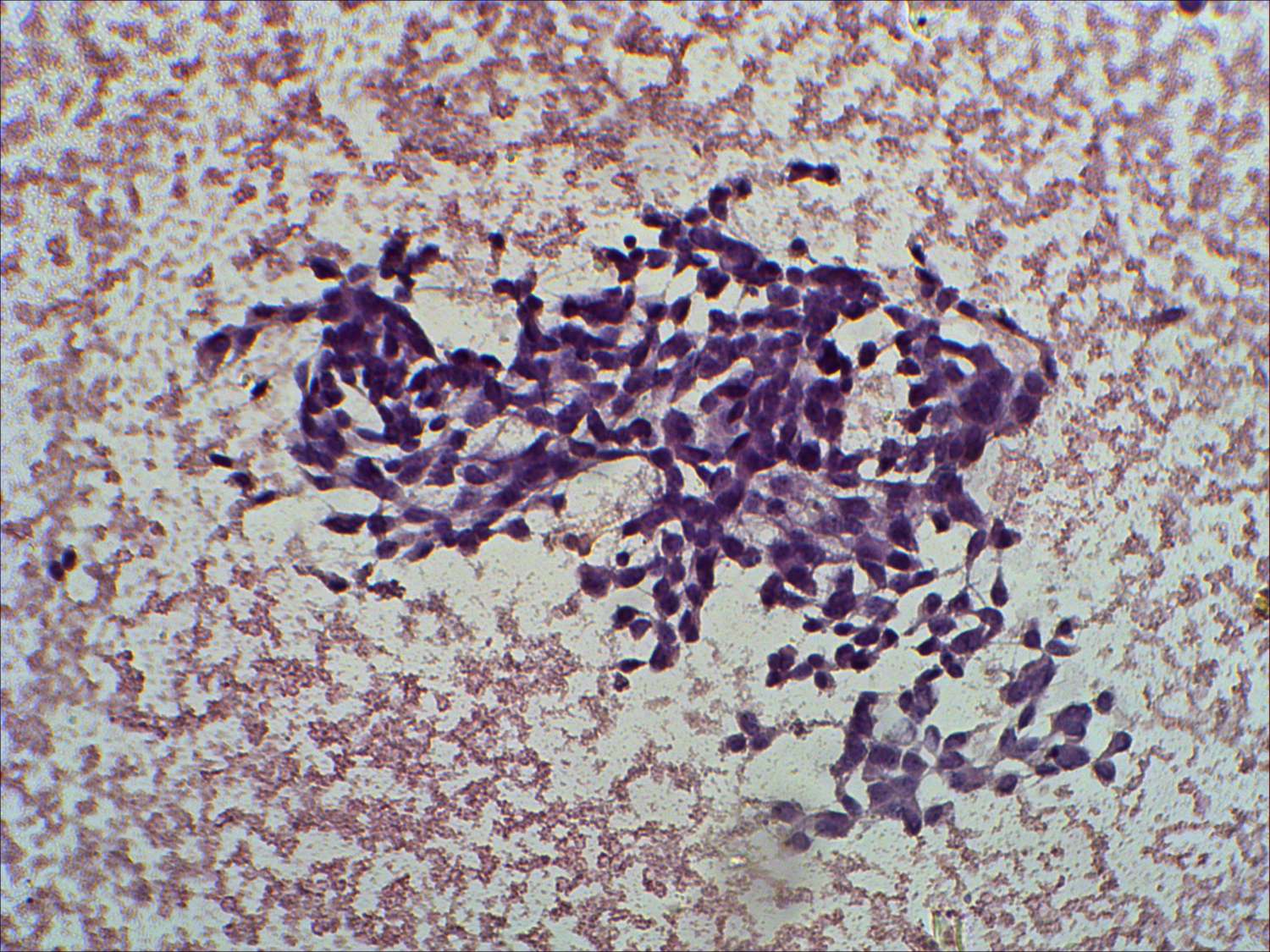 Pap-smear, 200x. Elongated spindle cells are demonstrated on this image.