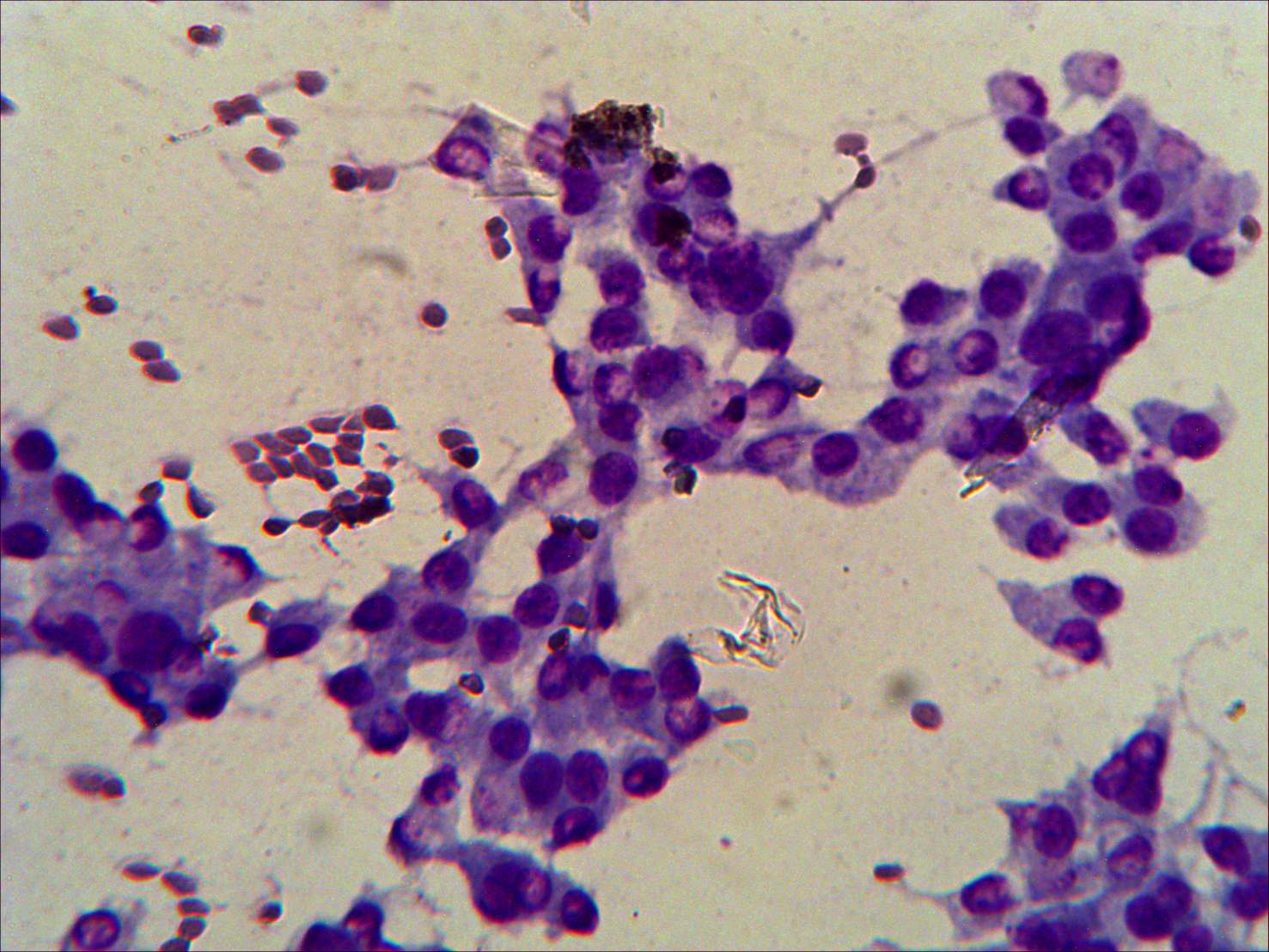 Smear 2. Wright-Giemsa staining, 400x. There are several polygonal forms and a few triangular cells. Note the presence of powder-like azurophil cytoplasmatic granulations.