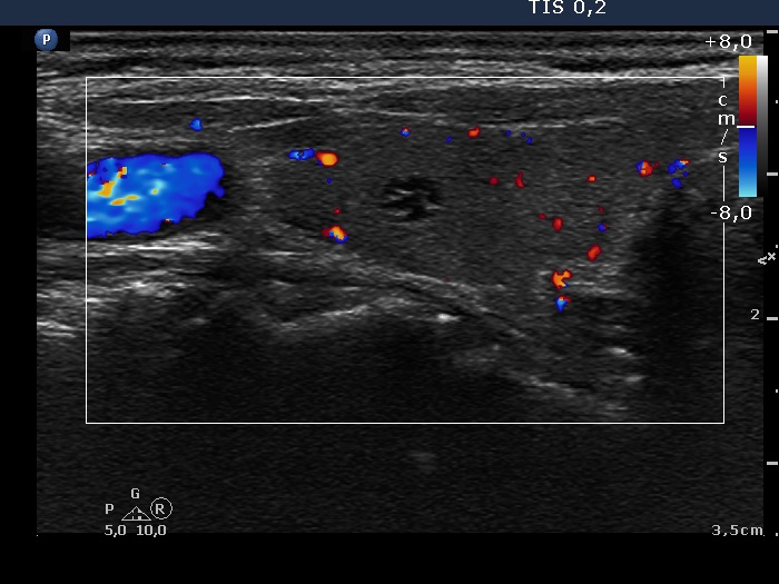 Ultrasonography. The thyroid was minimally hypoechogenic. There was a small cystic area in the central part of the right lobe. The maximal diameter of the lesion was 4 mm. It contained small hyperechogenic figures caused by posterior back wall enhancement.