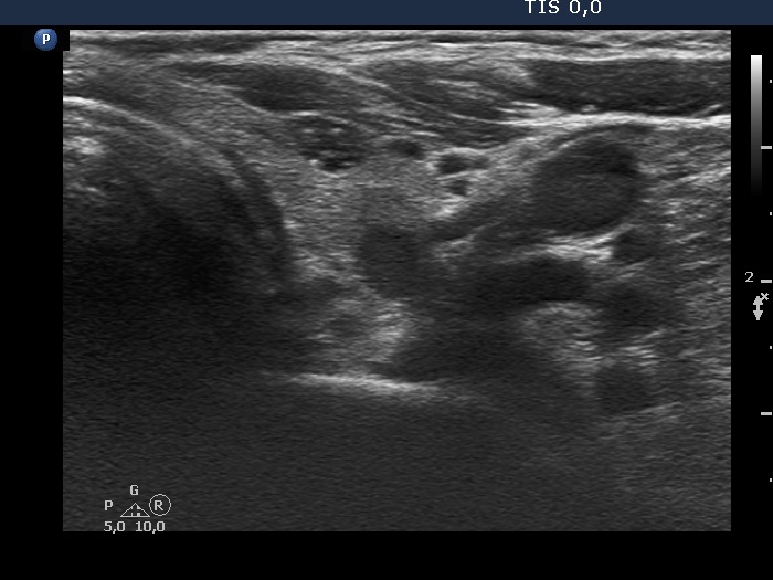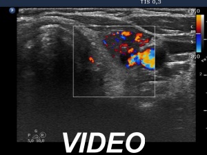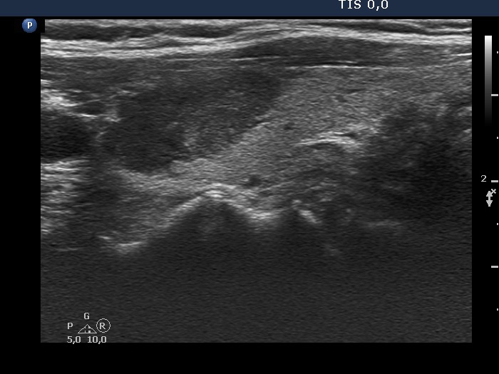 Ultrasonography. The thyroid was echonormal. There were several nodules in the left lobe. The largest in the upper pole presented all but one of the possible suspicious characteristics, it was deeply hypoechoic, had irregular margins, a microcalcification and showed abutting and bulging contours. Moreover, the intranodular vascularization was irregularly increased. One of the other lesions presented back wall figures while the third one showed taller-than-wide shape.