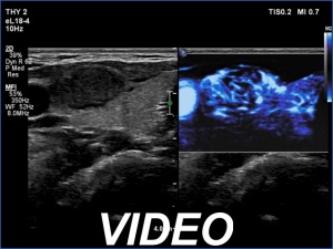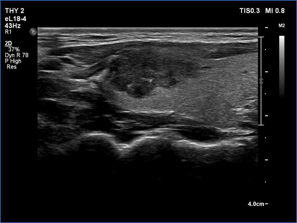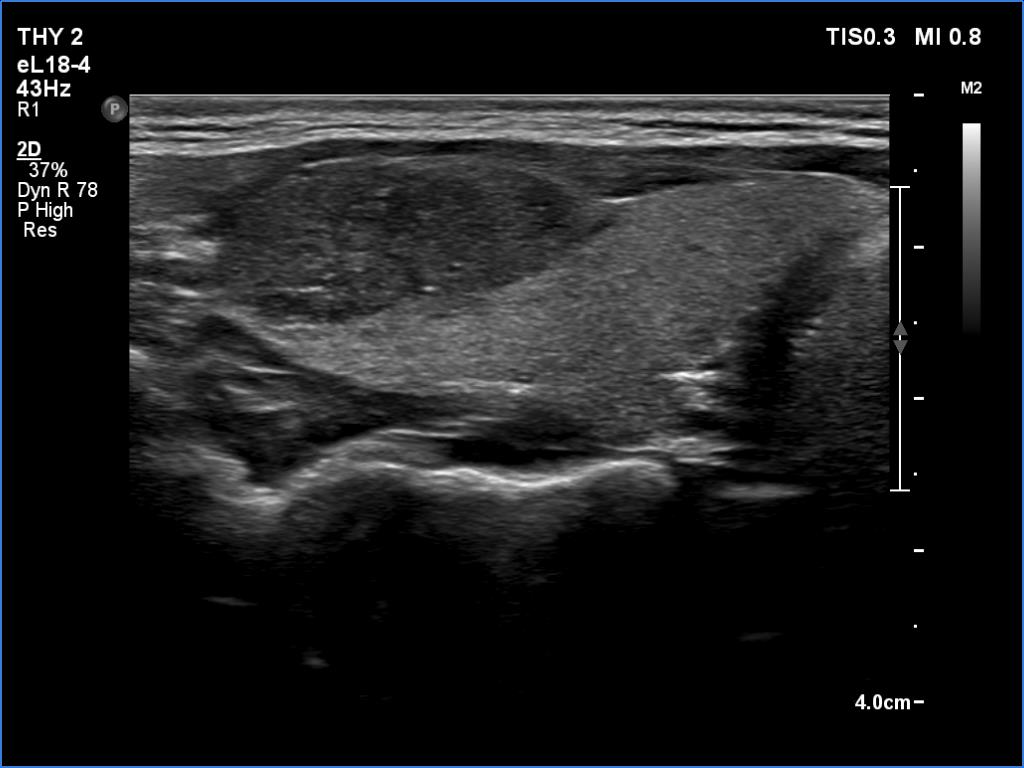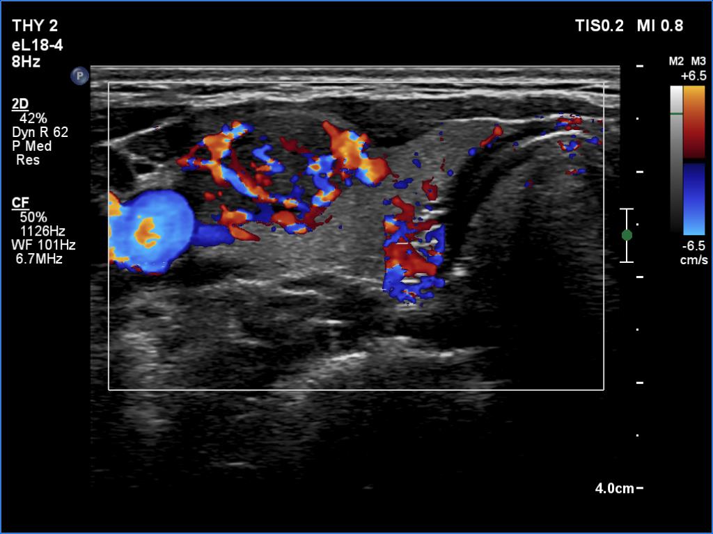 Ultrasonography. The thyroid was echonormal and presented two discrete lesions in the right lobe. The larger, upper one showed irregular margins, abutting and bulging contours and had back wall figures. The intranodular vascularization was significantly increased. The smaller lesion had microcalcifications and presented taller-than-wide shape.