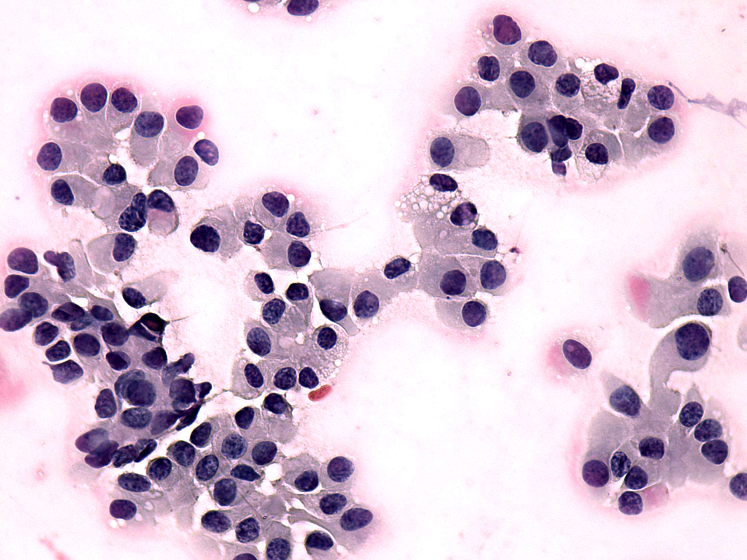 Pap-smear, 400x. Note vacuolization. The degree of anisonucleosis didn't matters if the origin of the cells would be thyroid but could be held significant if the cells arised from the breast.