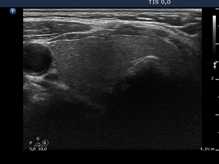 Ultrasonography: the right thyroid was echonormal while the left lobe contained moderately hypoechogenic areas with a 50% echogenicity index. There was a hypoechogenic mass lower and lateral to the right thyroid. The lesion did not present a regular hilum.