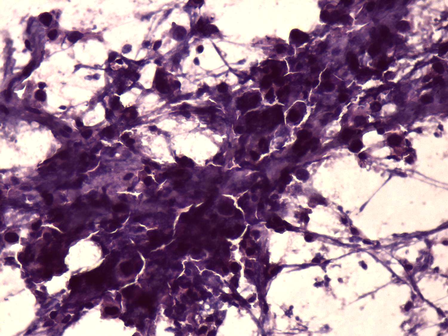 Pap-smear, 400x. An irregular cluster of tumor cells mixed with inflammatory components.