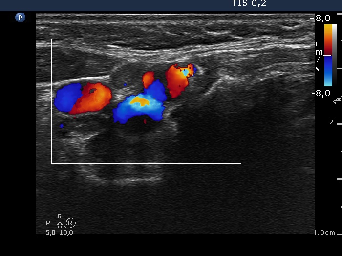 Right submandibular area, transverse scan, color Doppler mode. There are two lymph nodes lateral and medial to the vessels, in the image left and right, respectively.