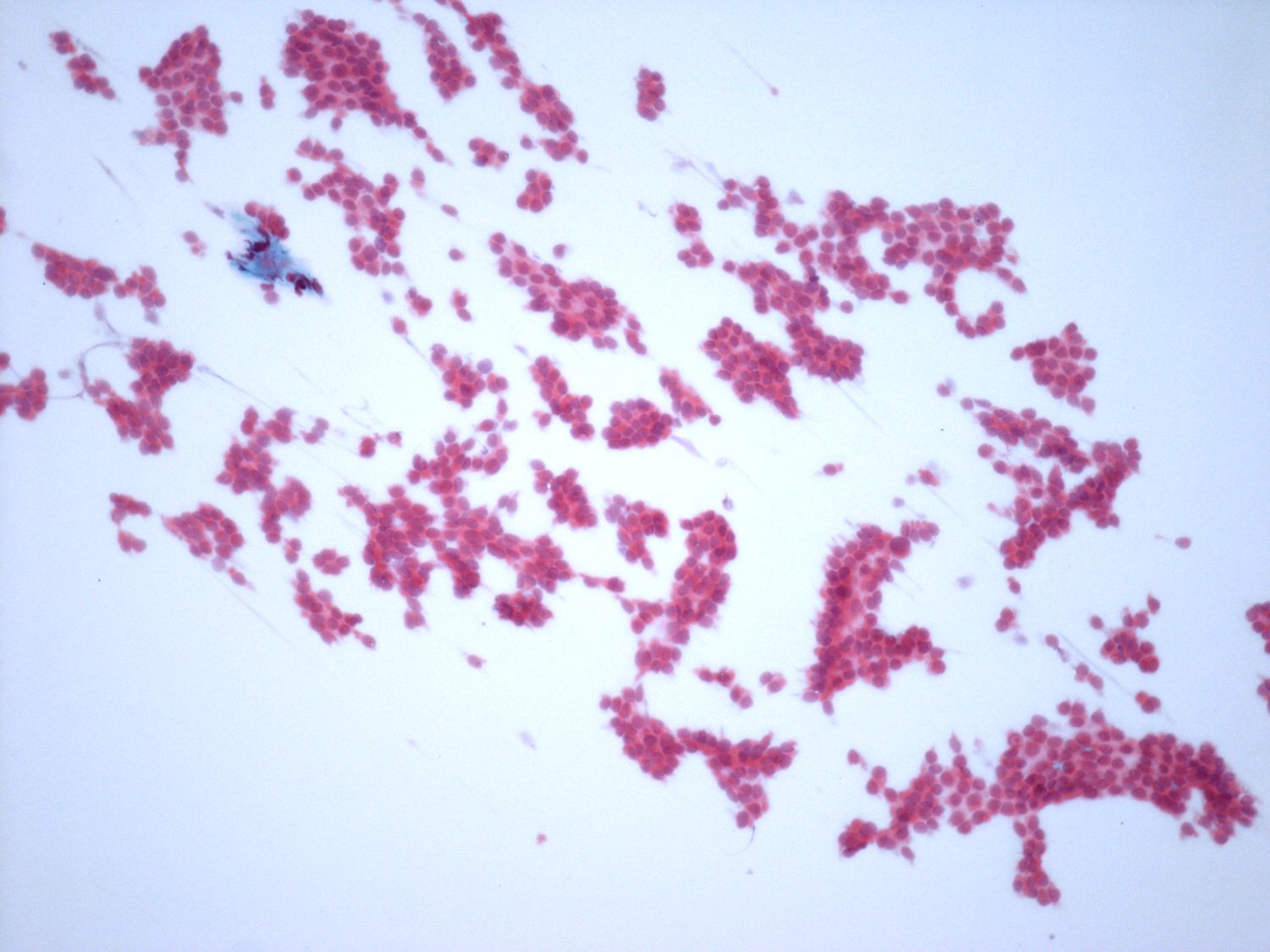 Pap-smear, 100x. There is no colloid in the background. Thyrocytes are in clusters and in microfollicles.