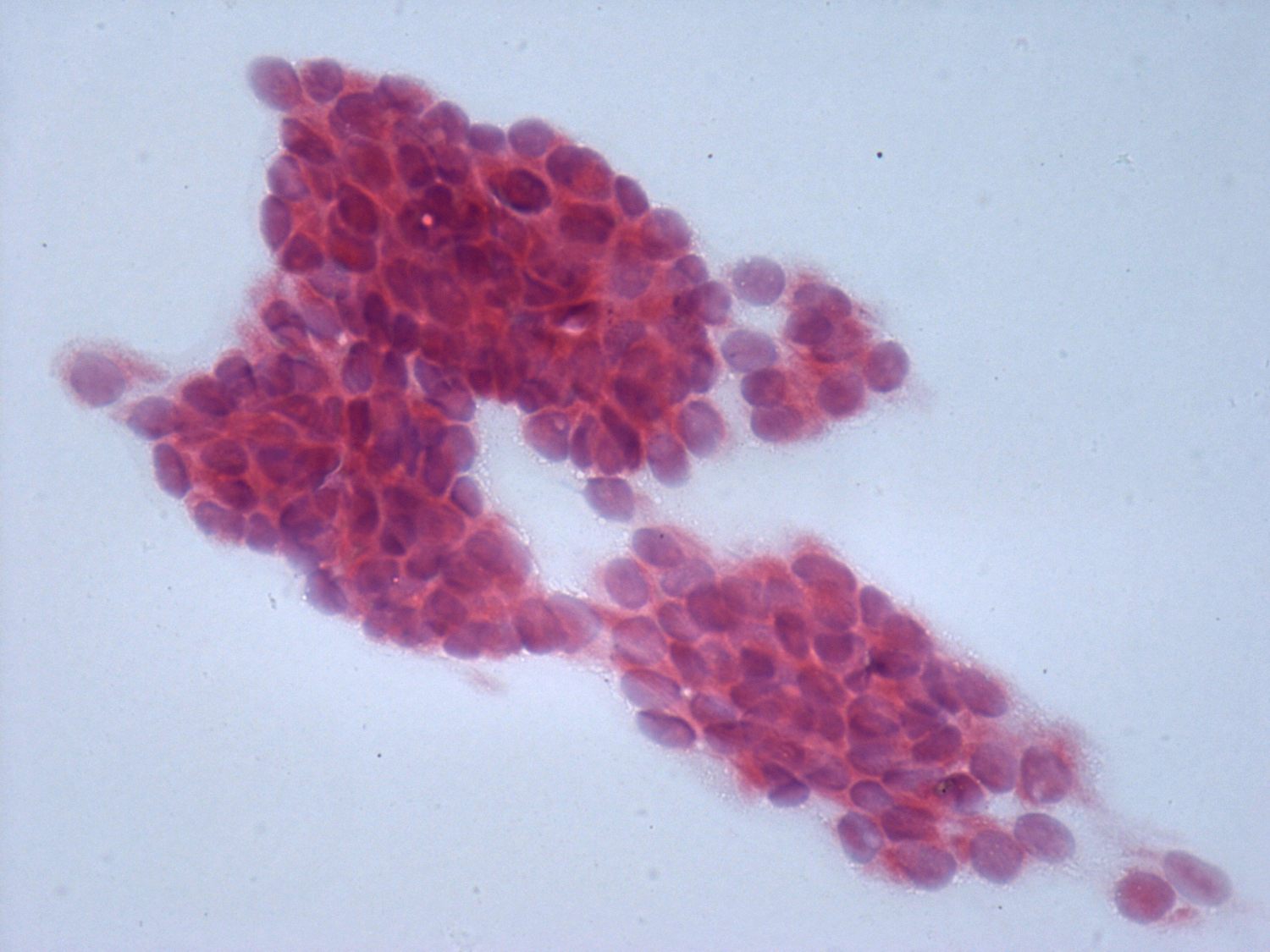 Pap-smear, 400x. An irregular papillary cluster with nuclear crowding and overlapping.