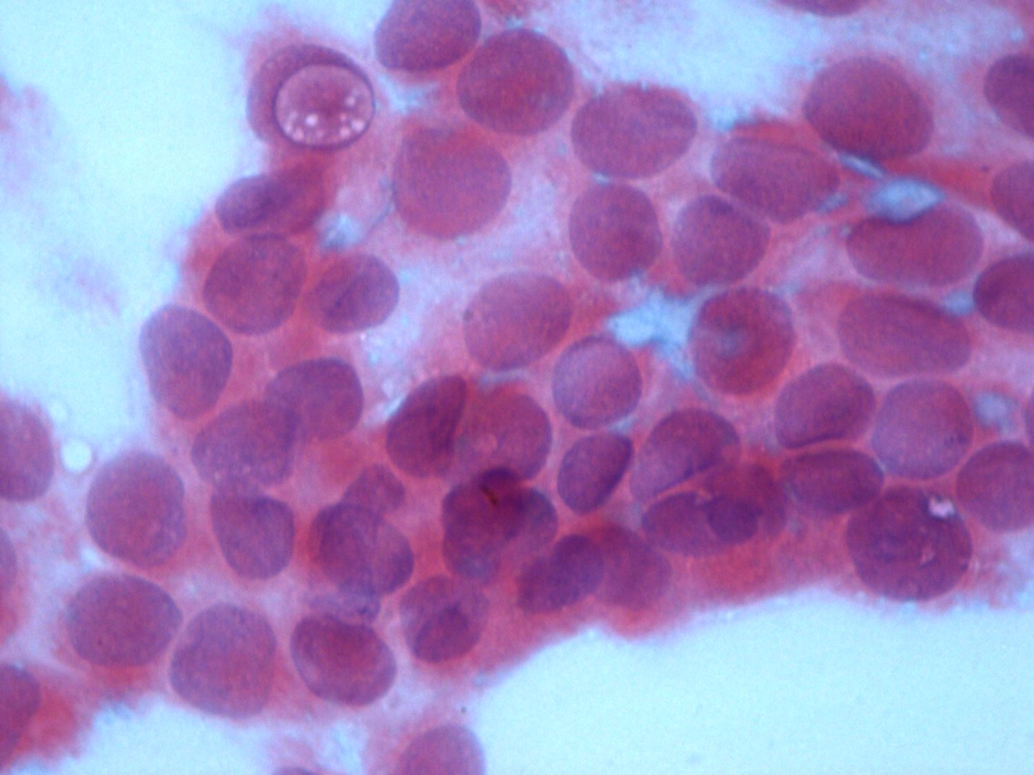 Pap-smear, 1000x. Note one cell with an intranuclear inclusion.