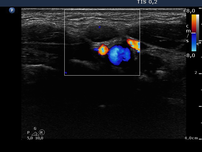 Left side of the neck, above the thyroid, transverse scan, color Doppler mode. There is no vascularization according to the lymph node.