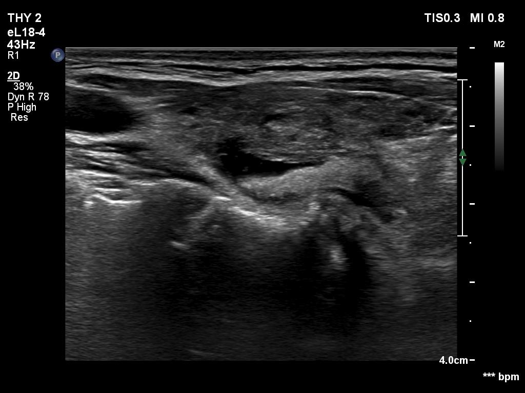 Clinical data: A 44-year-old woman was referred for aspiration cytology of a cystic mass which was found on ultrasound examination. Ultrasound was performed as part of the evaluation of a newly diagnosed hypothyroidism 3 months ago.