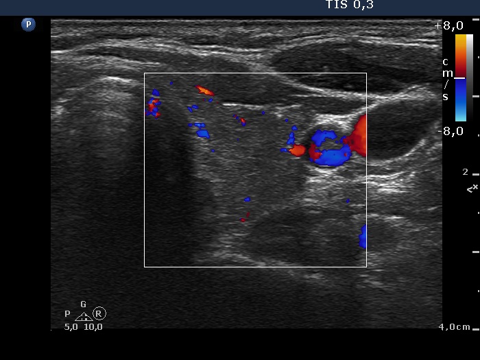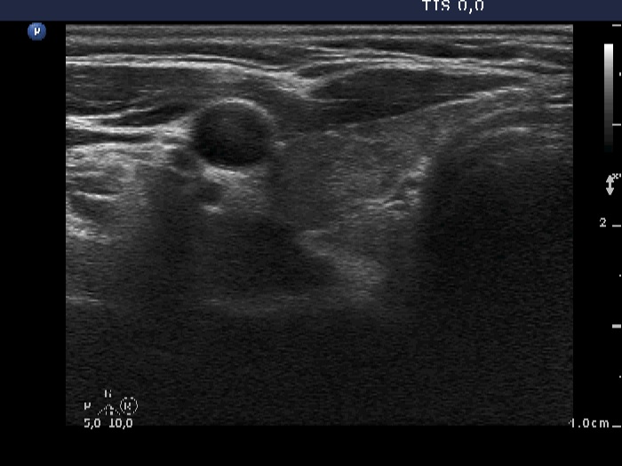 Ultrasonography: The thyroid was minimally-moderately hypoechogenic and presented fibrosis. There was a cystic lesion in the lower dorsal part of the right thyroid bed.