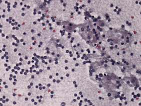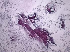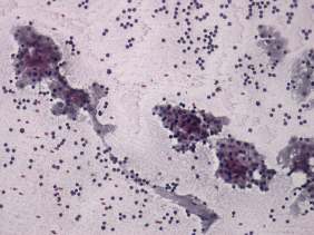 There is no specific cytological sign of a parathyroid lesion. The pattern is identical with a normofollicular adenoma with signs of hormonal influence.