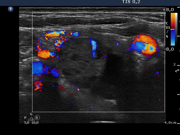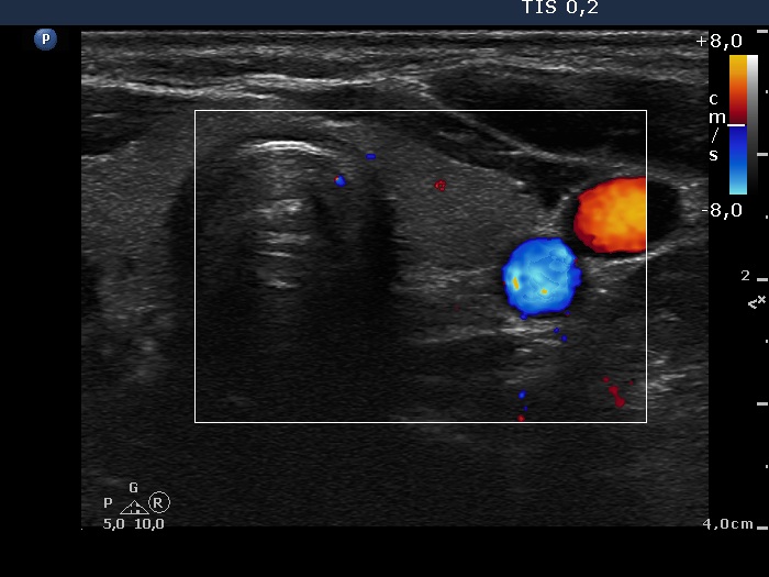 Ultrasonography: The thyroid was echonormal and intact. There was a cystic-minimally hypoechogenic mass lateral and lower to the right thyroid. The vascularization was not specific.