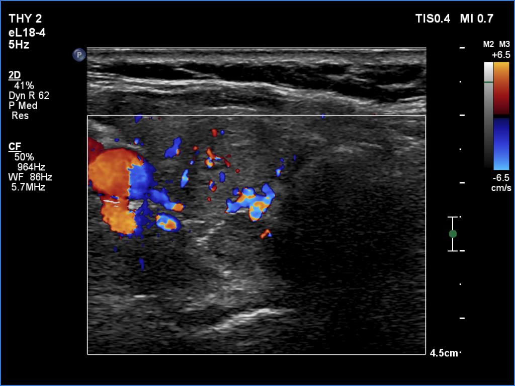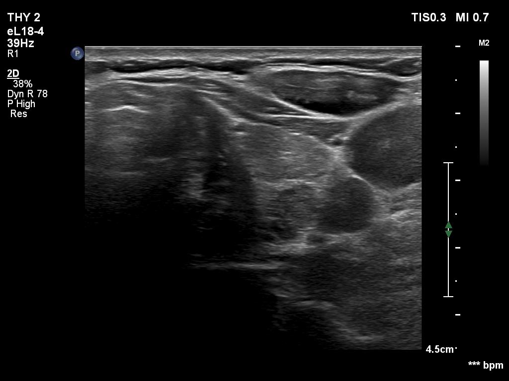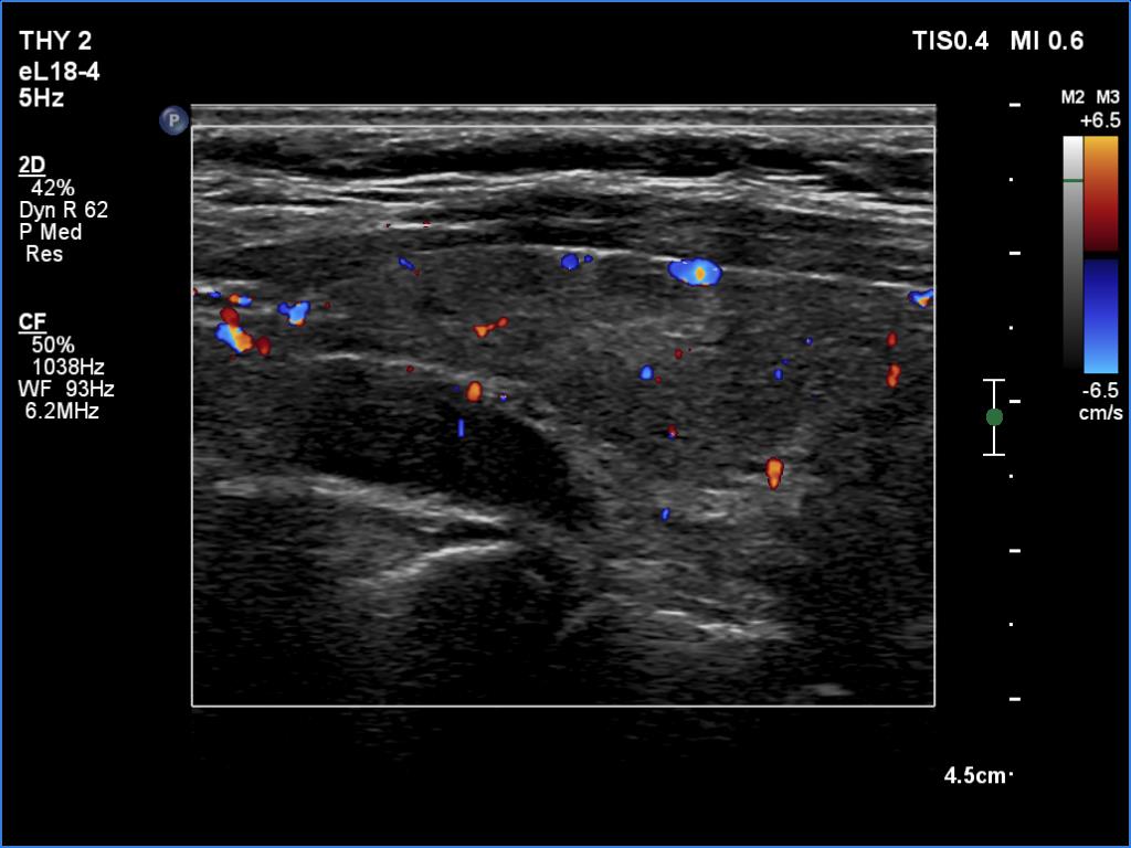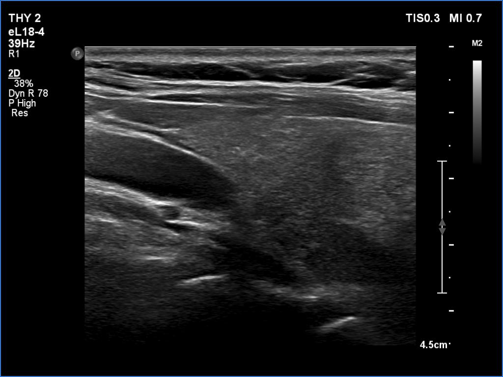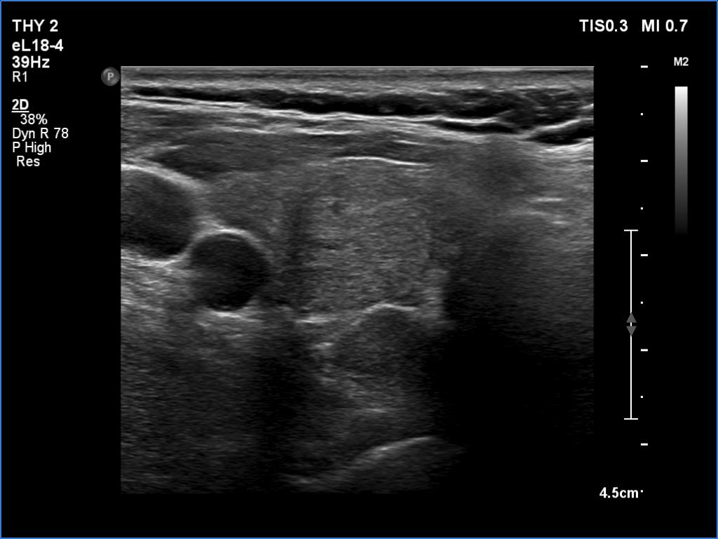 Ultrasonography. The thyroid was moderately hypoechoic. There were two discrete lesions in the right lobe while a hypoechoic mass was found dorsal to the middle third of the left lobe.