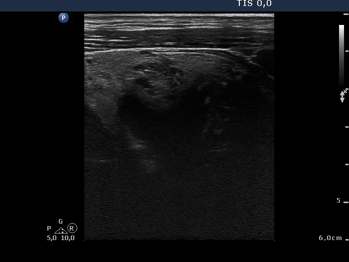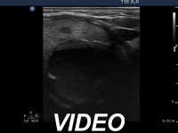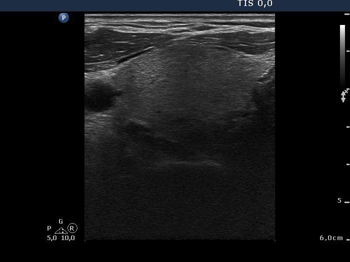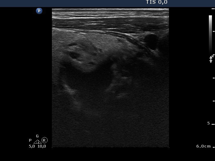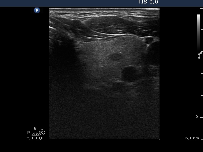 Ultrasonography: The thyroid was echonormal with a few insignificant lesions. There was a large cystic lesion dorsal to the lower third of the right lobe.