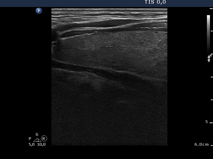 After aspiration of 10 ml yellow fluid the size of the lesion decreased from 35x31x42 mm to 29x22x39 mm. The patient refused to aspirate more fluid because her complaints ended.