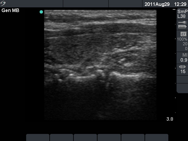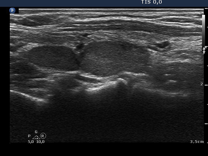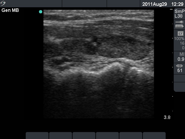 Ultrasonography: The thyroid was moderately hypoechogenic. There were two more hypoechogenic lesions in the dorsal part of the right lobe.