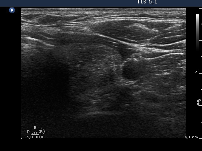 Lower part of the left lobe, transverse scan. There is a hyperechogenic, inhomogeneous nodule.