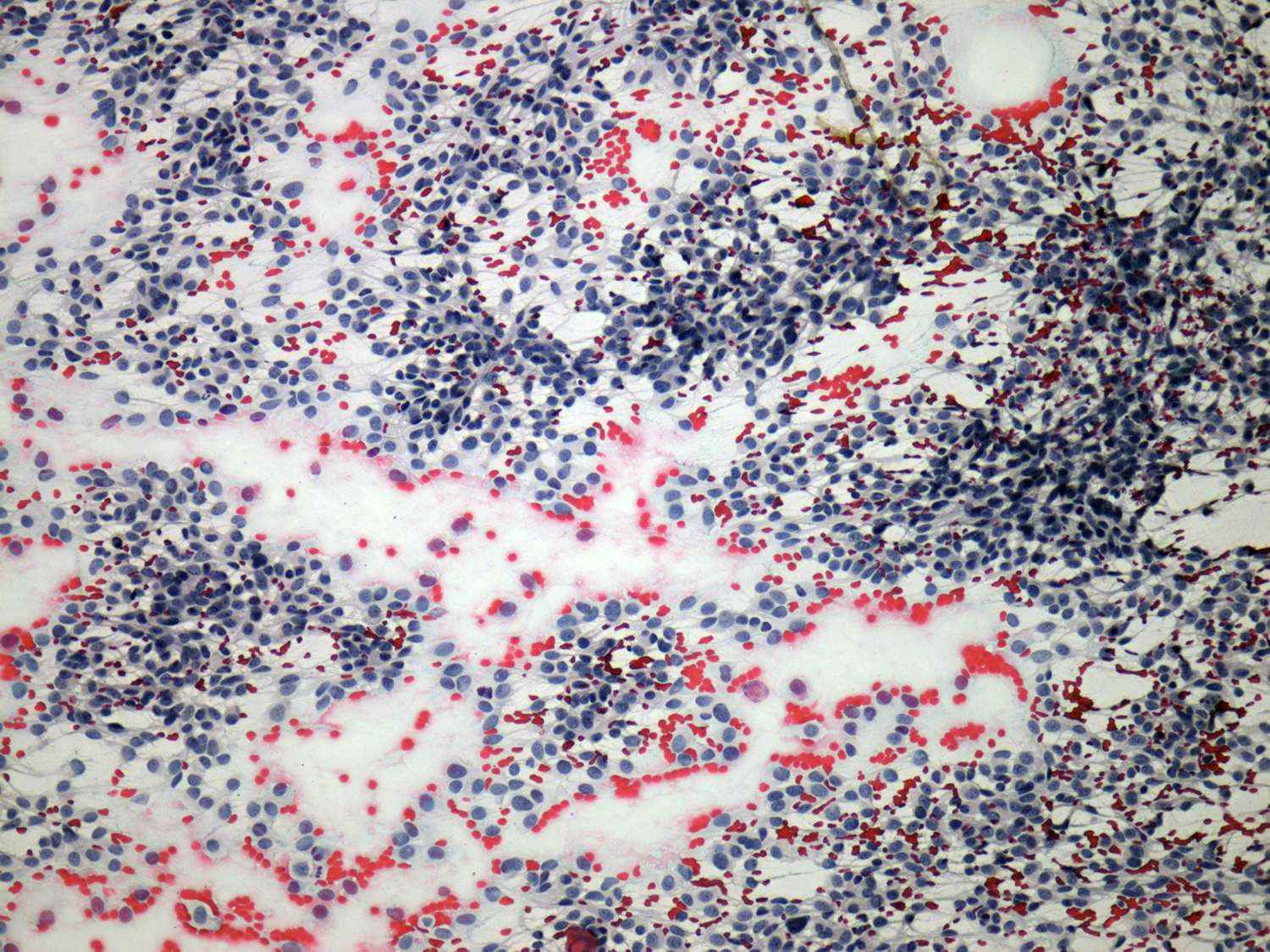 Pap-smear, 200x. Elongated cells are presented. Note lack of follicle formation. This pattern highly resembles medullary cancer.