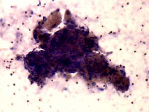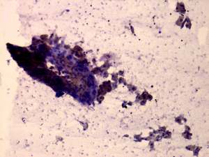 Cytology: Half mL brownish fluid was aspirated. A few cell-fragments were found in dirty background. The fragments resembled a palisading cell-structure. The nuclei within the clusters were elongated.