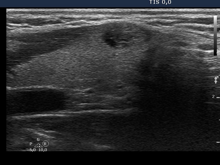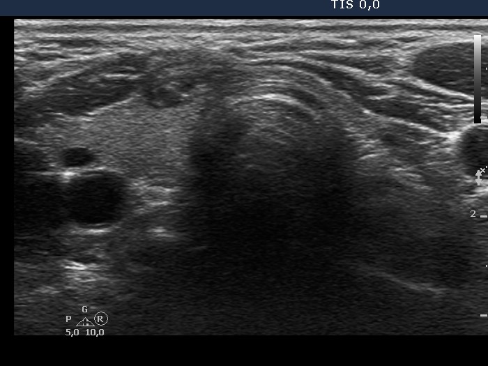 Ultrasonography. There was a mixed solid cystic nodule in the right side of the isthmus. Otherwise, the thyroid was intact.