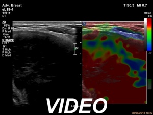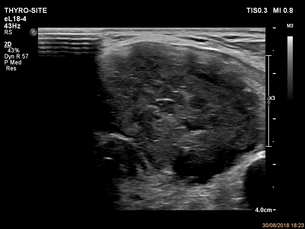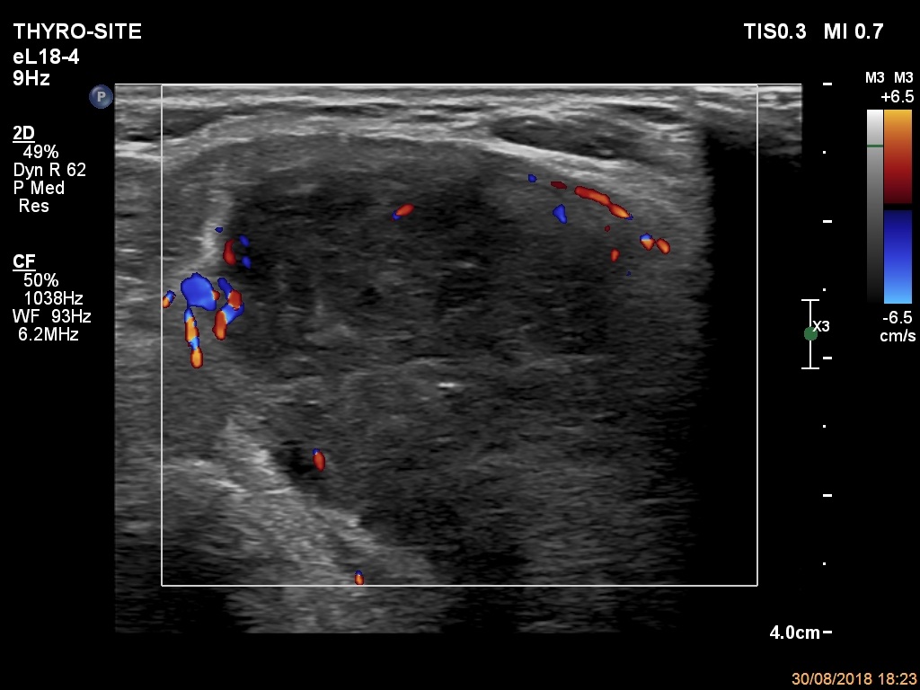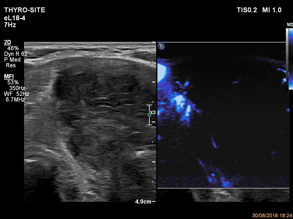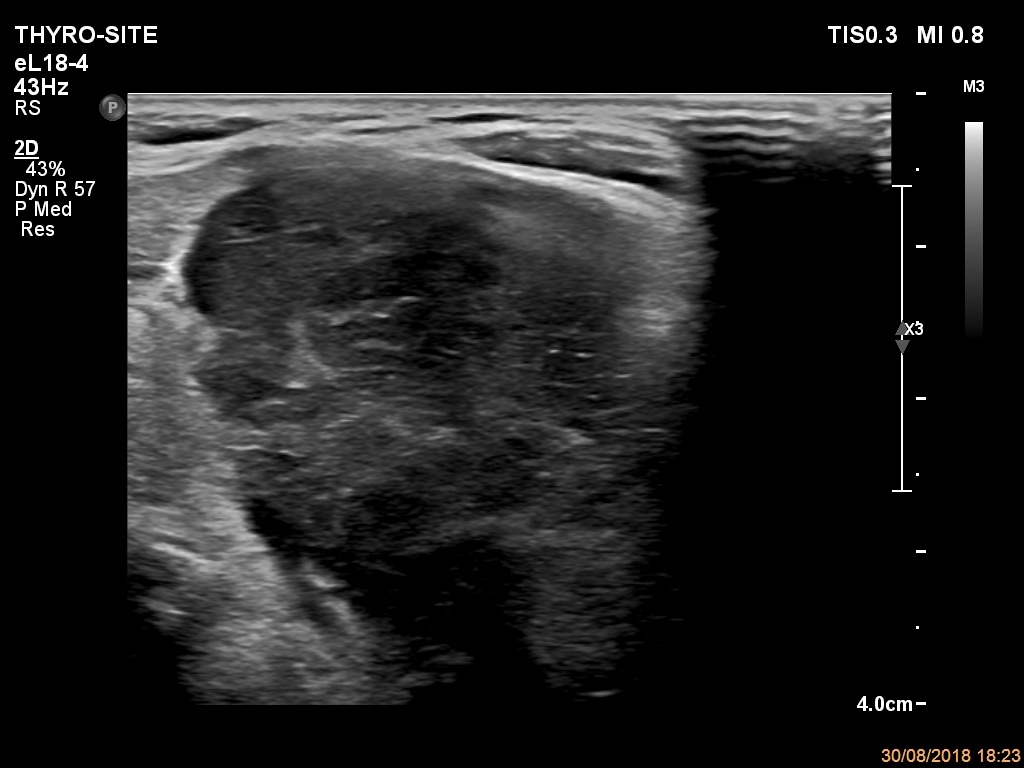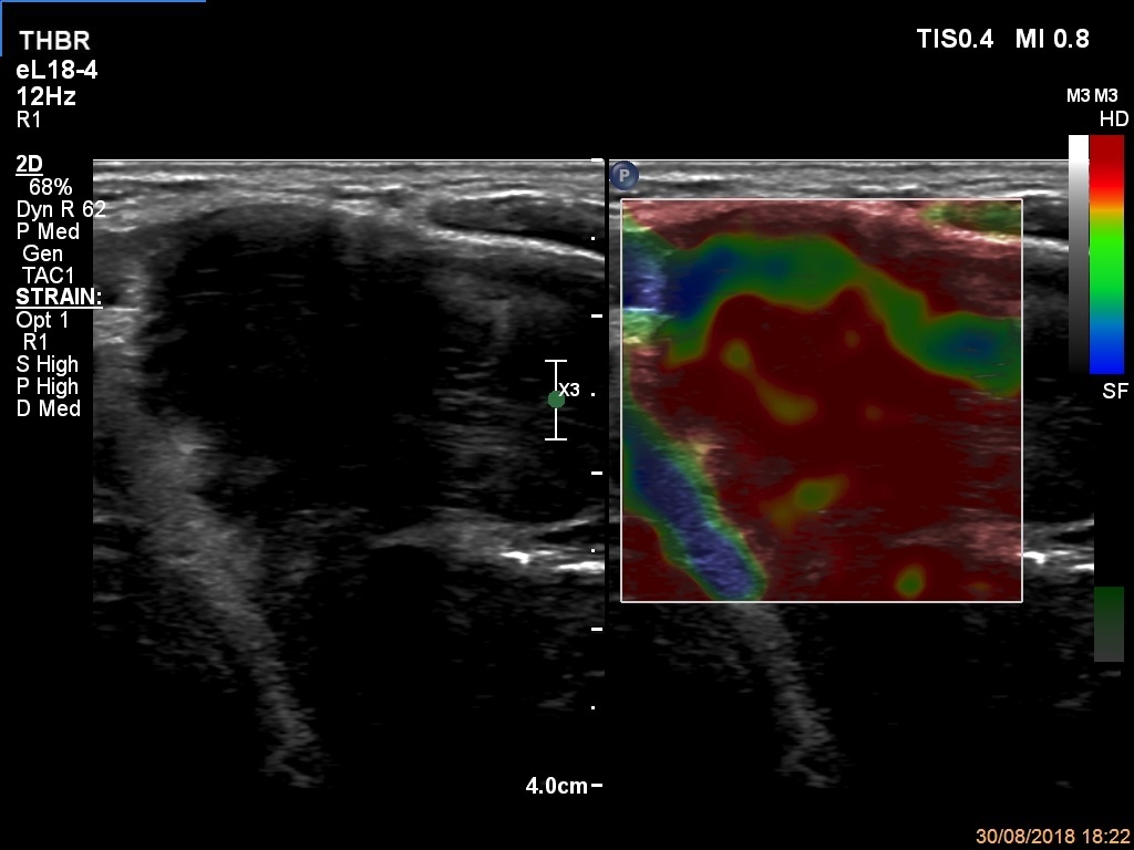 Ultrasonography. The thyroid was echonormal. There were a few hypoechogenic areas in the right lobe. There was a hypoechogenic mass with irregular shape in the left lobe. The lesion had echonormal fields and connective tissue. The microflow imaging revealed no intranodular vascularization while the lesion proved to be very hard on elastography.