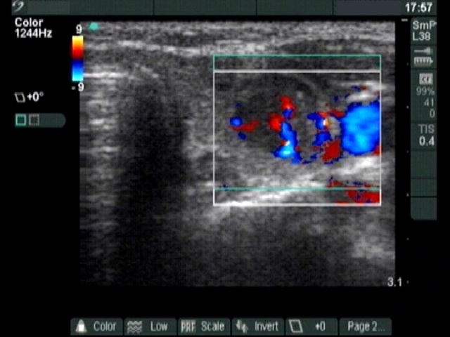 Left lobe, transverse scan, color Doppler mode. The lesion is hypervascularized.