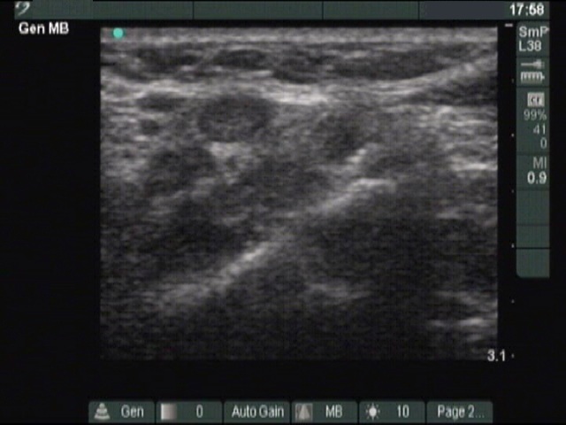 Above the left lobe, transverse scan. There is an enlarged lymph node without a regular hilum.
