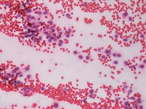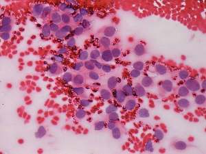 Clinical data: A 82-year-old man was referred for an evaluation of a rapidly increasing mass in the left thyroid. The tumor evolved over 3 weeks and caused palsy of the left recurrent nerve and dysphagia.