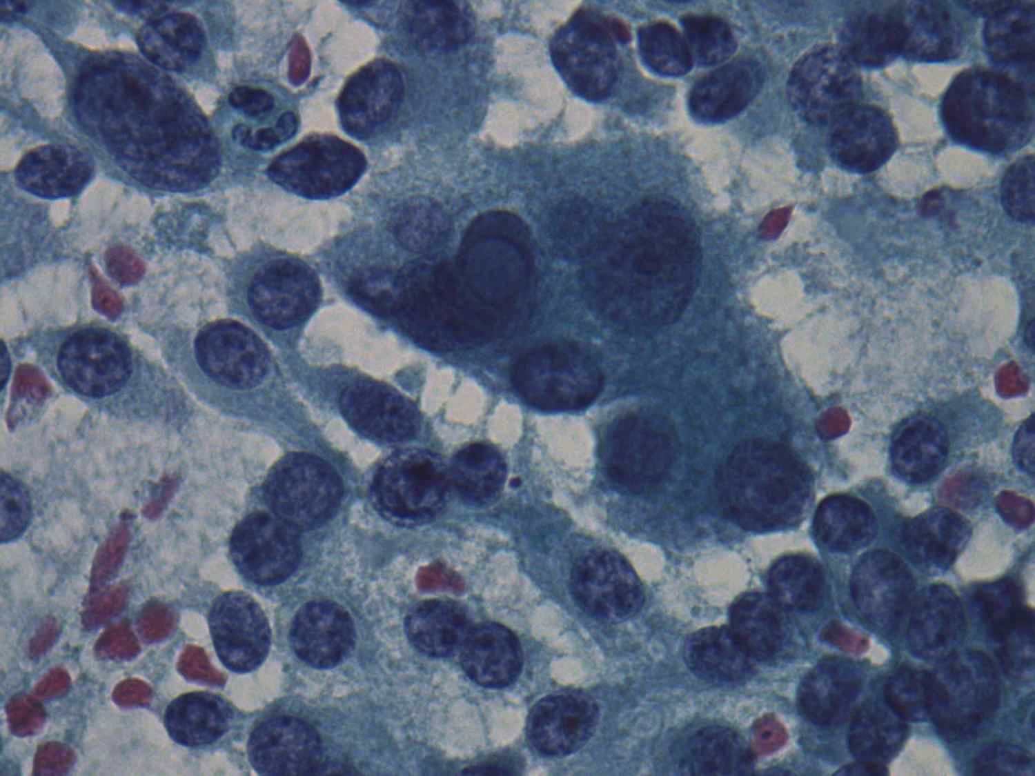 Pap-smear, 1000x. Polygonal and elongated cells are found. There are a few enlarged, atypical cells. There is a nucleus with inclusion.