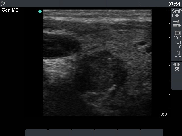 Ultrasonography. The right lobe was intact, while there was a hypoechogenic nodule in the left lobe. The lesion had hyperechogenic areas and coarse calcifications. A lymph node was detected lateral to the left thyroid.
