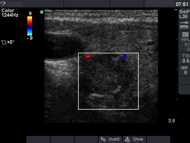 Palpation: The thyroid was not palpable. There was a not freely moveable lymph node lateral to the left thyroid lobe.