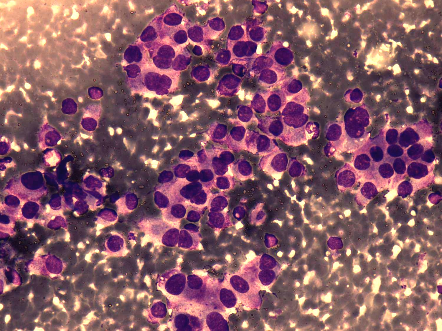 Wright-Giemsa staining, 400x. Note the pathognomonic azurophilic granulation in the cytoplasm.