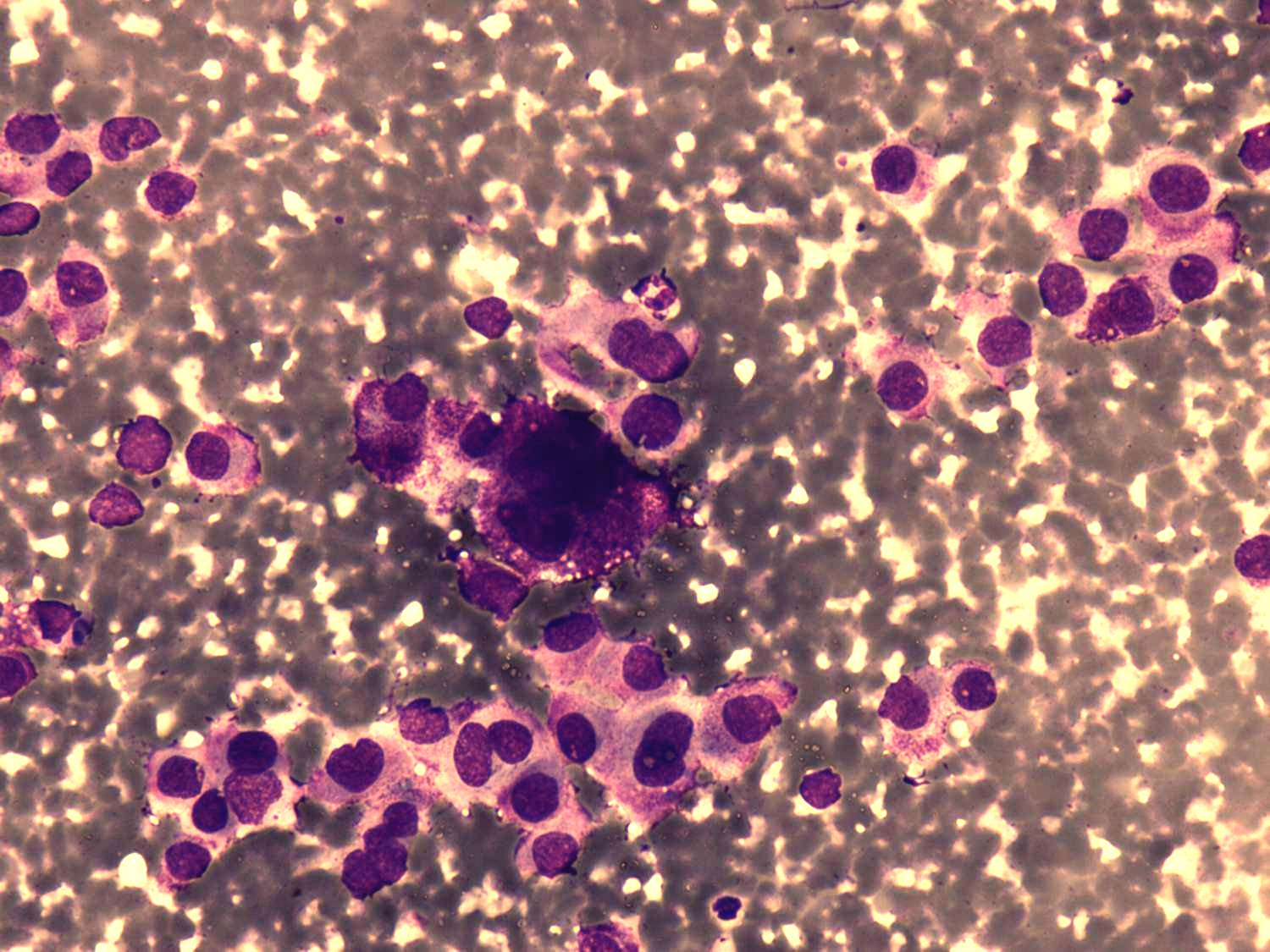 Wright-Giemsa staining, 400x. The cells present with eccentric nuclei.