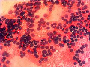 Cytological picture. There was no colloid in the background. Dispersed, mostly naked cells predominated the smear. The pattern resembled a lymphoplasmacytoid population. A few polygonal cells were observed on the smear.
